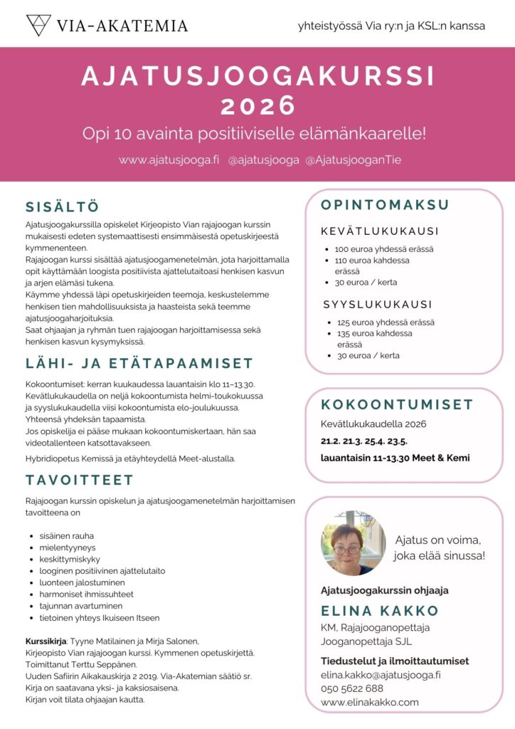Tiedustelut ja ilmoittautumiset elina.kakko@ajatusjooga.fi tai (050)5622688.